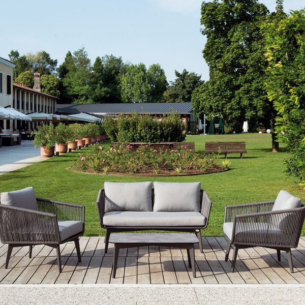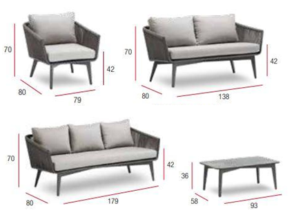 Elegantní a moderní zahradní sedací souprava Diva je na první pohled zajímavým typem exteriérového nábytku. Konstrukce sedací soupravy je hliníková a je stříkanápráškovou barvou. Výplet tvoří měké lano, které dodává celé sestavě velmi moderní vzhled. Polštáře jsou z polyesterové tkaniny, jsou voděodpudivé a mají snímatelné potahy. Konferenční stolek má HPL kompaktní stolovou desku, která je široká 12 mm. Také konferenční stolek má konstrukci z hliníku. Jednotlivé moduly a jejich rozměry můžete vidět na přiloženém obrázku.