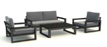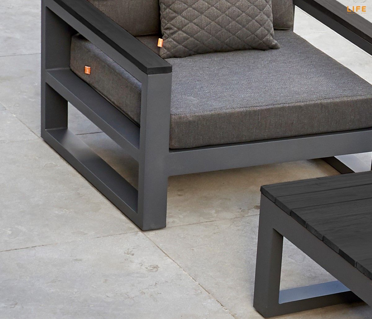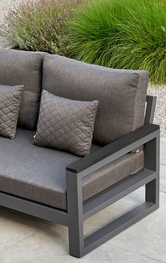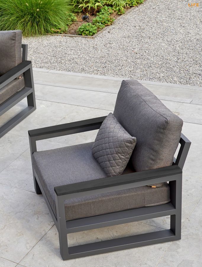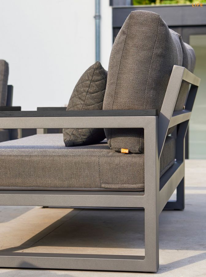 Zahradní sedací souprava Mallorca Lounge je perfektní volbou pro ty, kdo si rád vychutnává čas strávený na terase. Sedací souprava Mallorca je dostupná i v rohové verzi. Hliníková konstrukce sedací soupravy je doplněná na opěrkách a konferenčním stole o polywoodové (polypropylenové) laťky, které imitují dřevo natřené černou barvou. Matrace a polštáře mohou být celoročně venku díky All Weather Cushions. Podsedáky a polštáře jsou dostupné ve dvou variantách a to Black Carbon All Weather a Mist Grey Soltex.