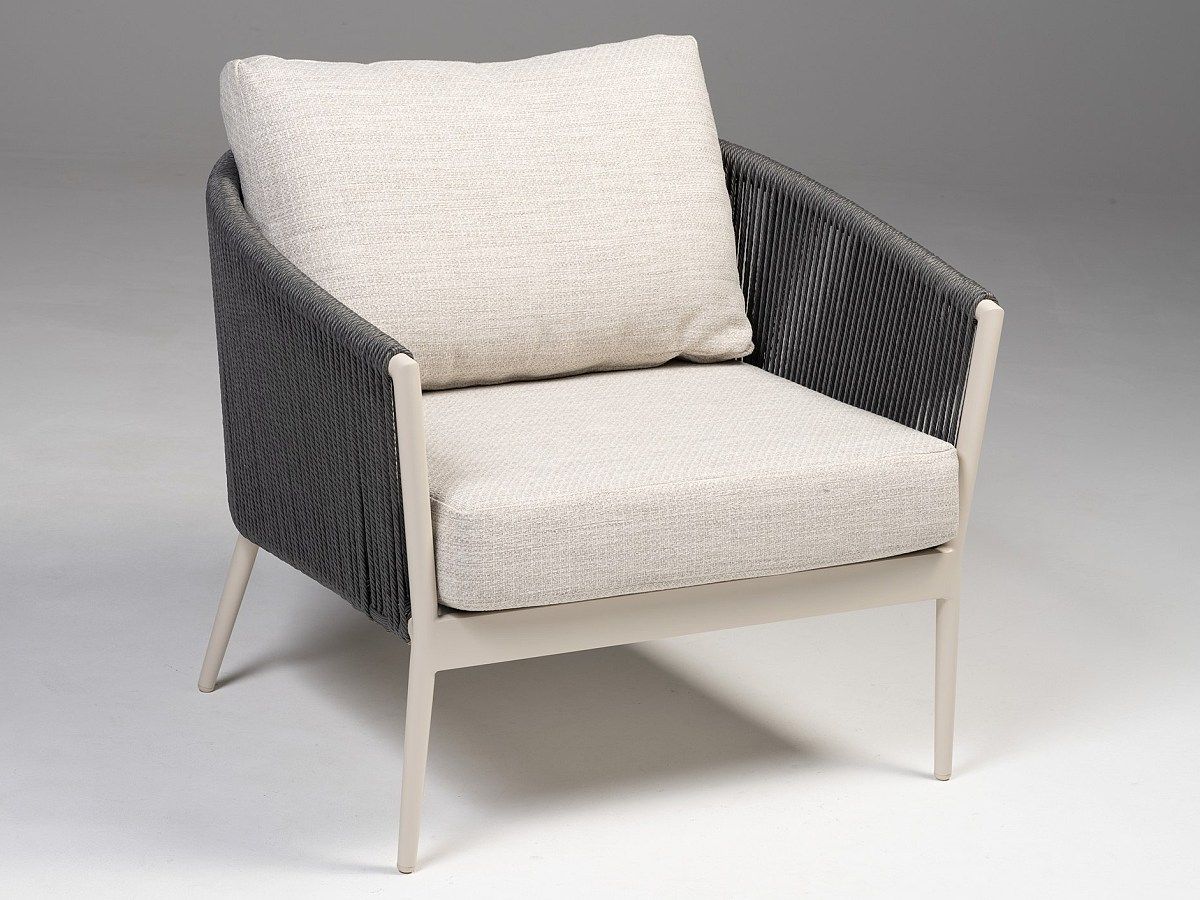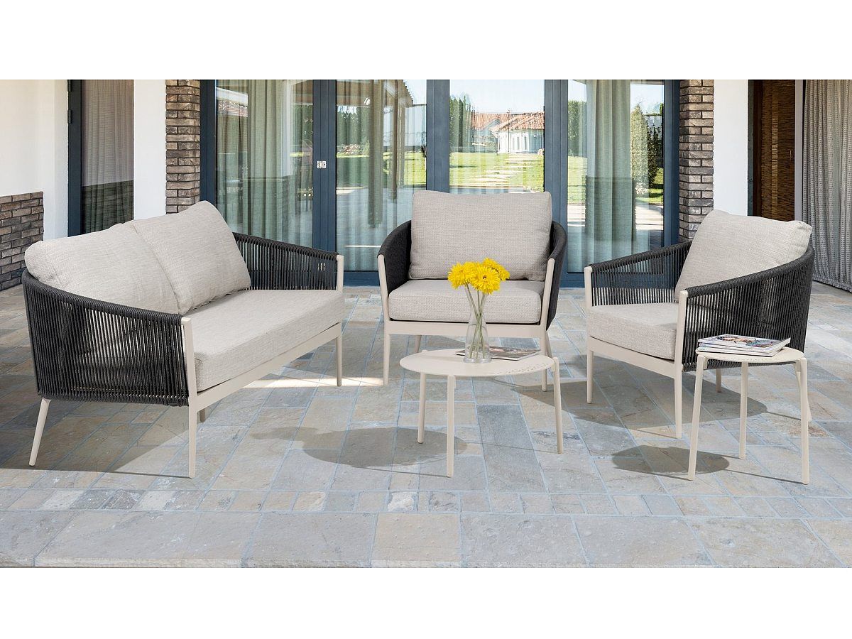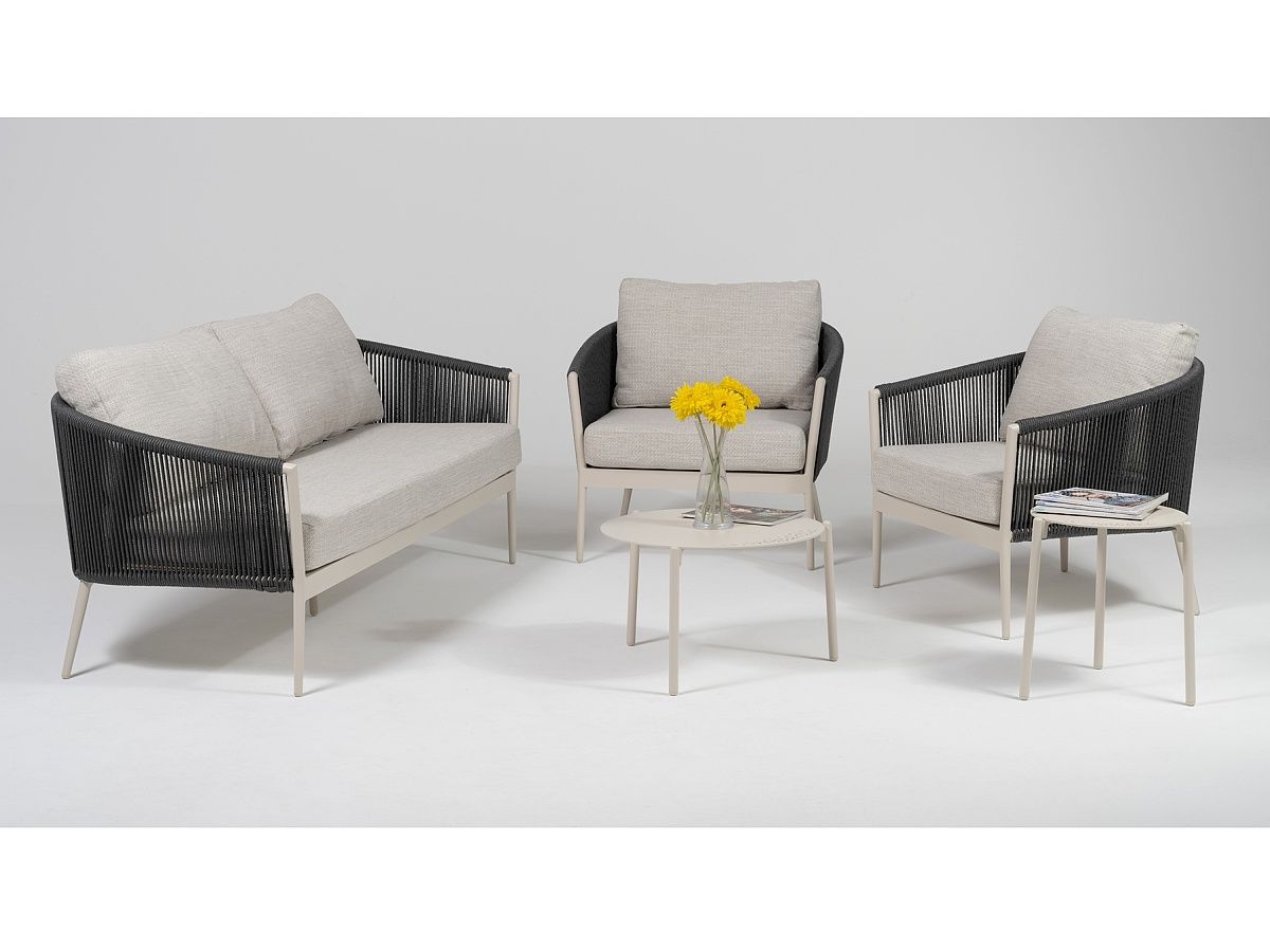 Úžasně pohodlná a designová zahradní sedací souprava Mango Ivory Dunkel je ideálním společníkem pro dlouhé letní posezení. Konstrukce sedací soupravy je hliníková a je stříkaná práškovou barvou v odstínu Ivory. Opěradla na křeslech a dvojsedačce jsou ovinuté tkaným syntetickým lanem tmavě šedé barvy, která dodávají celému designu nádech modernismu. Podsedáky a opěrkové polštáře jsou světle šedé barvy a jsou odolné vůči povětrnostním vlivům. Konferenční stolky mají konstrukci z hliníku stejné barvy jako jsou křesla a trojsedačka. V tomto designu máme i židle Mango, pokud byste si chtěli sladit sedací a stolovou soupravu.