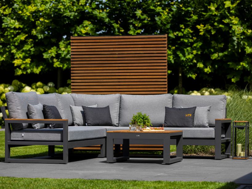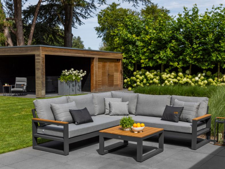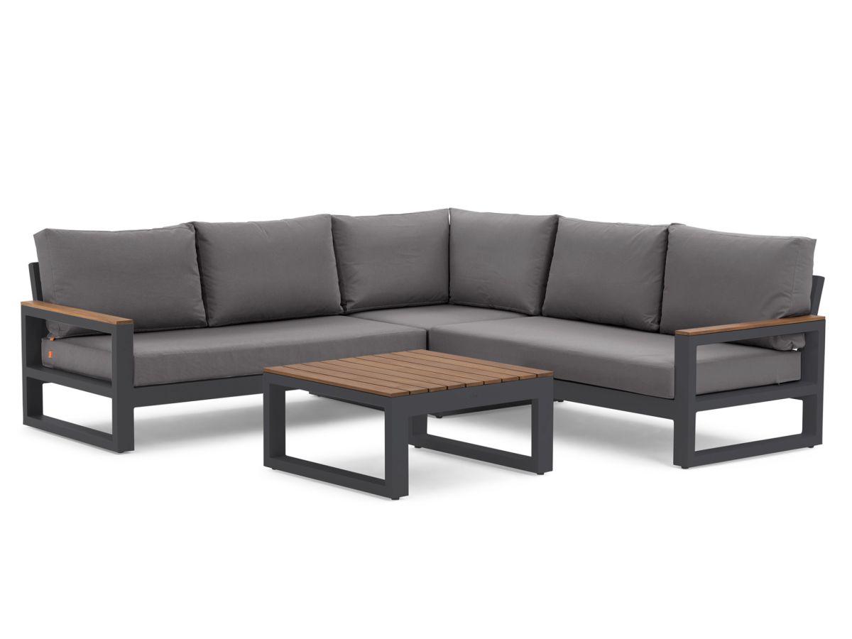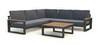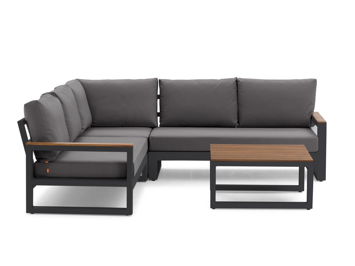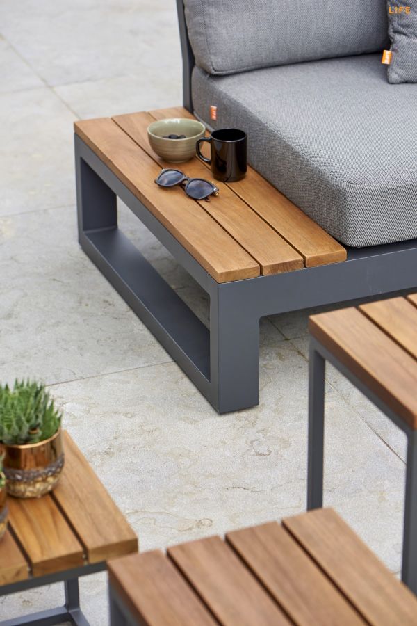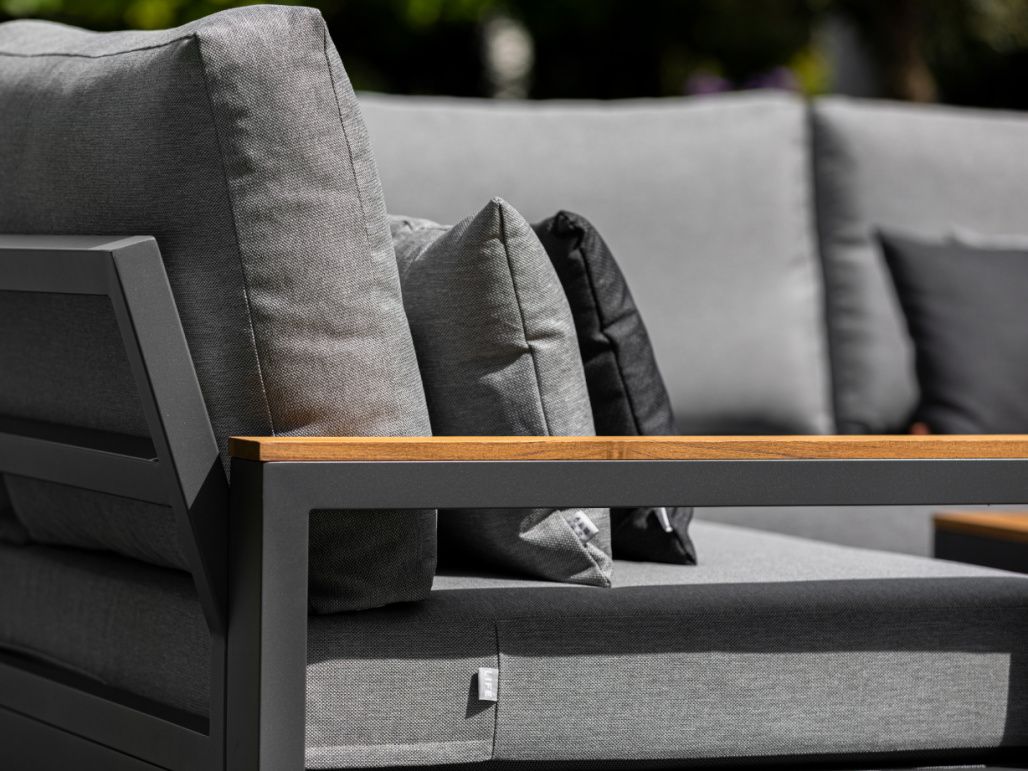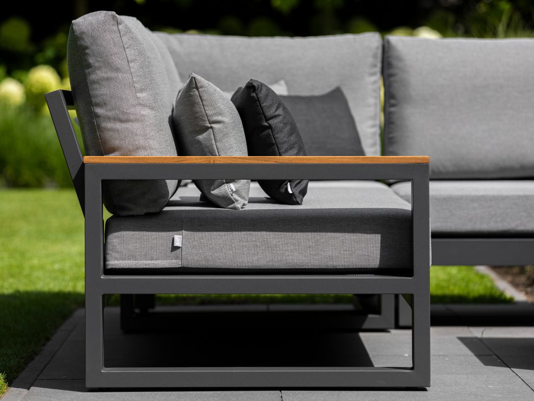 Variabilní rohová sedací souprava Soho Corner dodá Vaší terase punc dokonalosti. Výhodou této sedací soupravy je, že si ji můžete poskládat podle svých představ. Sedací souprava má hliníkový rám doplněný nepremokavými podsedáky a polštáři. Opěrky na L-kové sedací soupravě i na křesle jsou z teakového dřeva nejvyšší kvality. Stejně tak i stolek má hliníkovou konstrukci stříkanou práškovou barvou a je doplněný o teakovou desku. Sedací souprava je dostupná i ve verzi Lounge s dvojsedačkou.