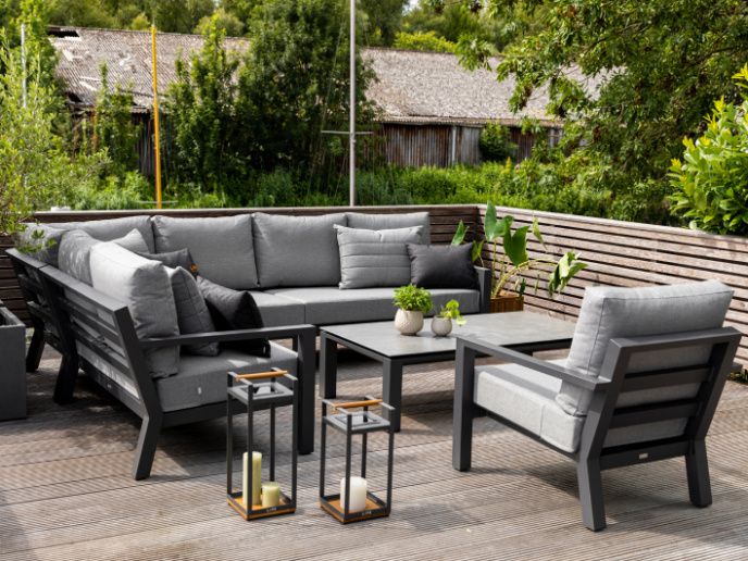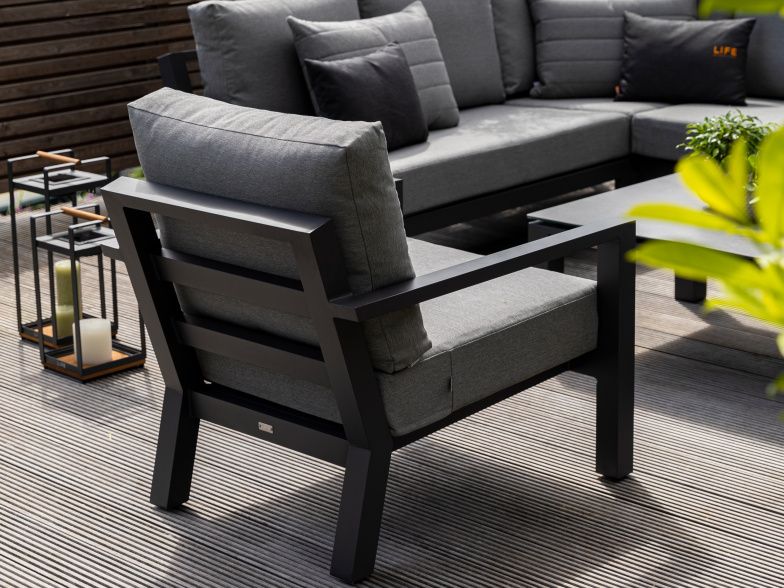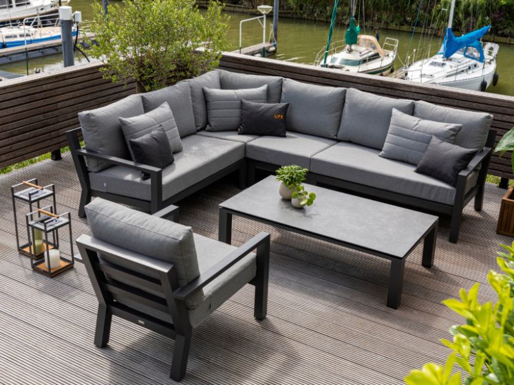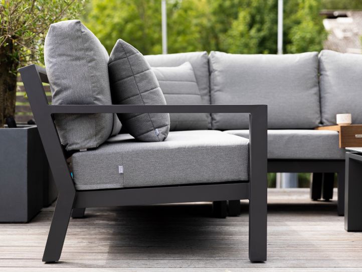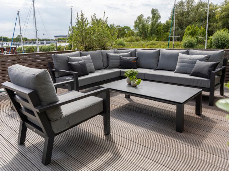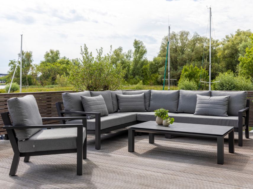 Rohová zahradní sedací souprava Timber Corner lava Luka má hliníkovou konstrukci stříkanou práškovou barvou. Stolek má keramickou stolovou desku (Ceramic Concrete look), takže je téměř bezúdržbový. Podsedáky i opěrkové polštáře jsou z odolného materiálu SOLTEX nebo ALL WATHER CUSHIONS, které jsou vhodné do každého počasí. Jsou dostupné ve třech variantách, a to Carbon All Weather, Mist Grey Soltex a Graphite Soltex.