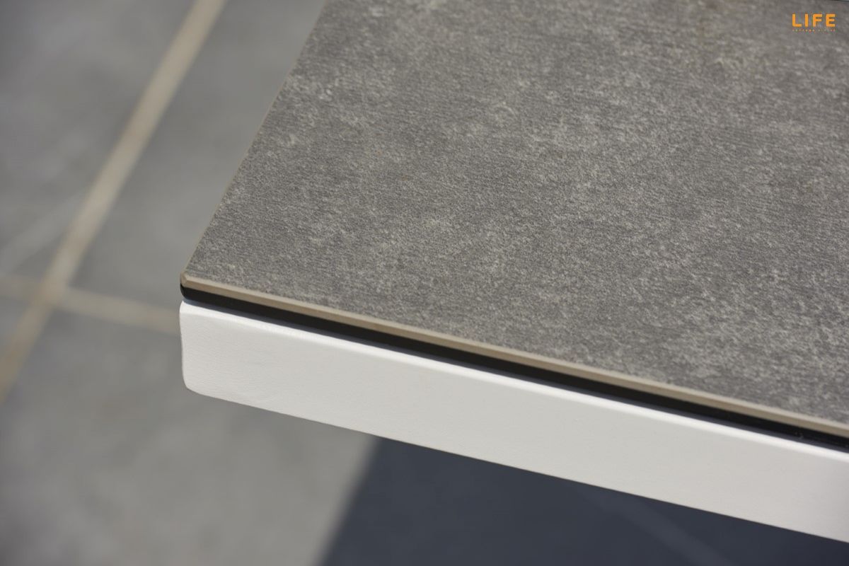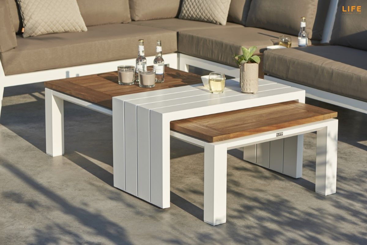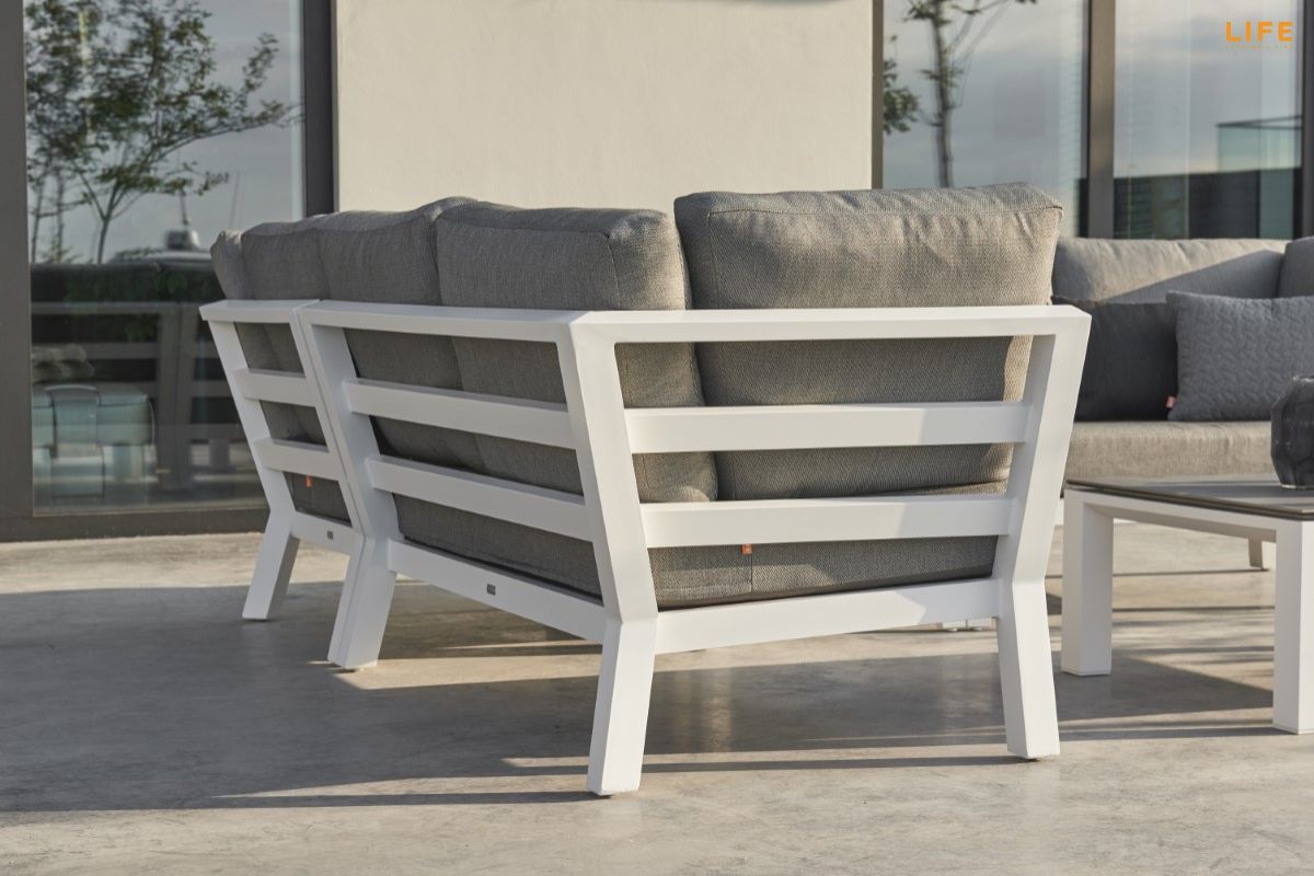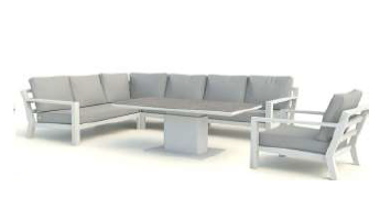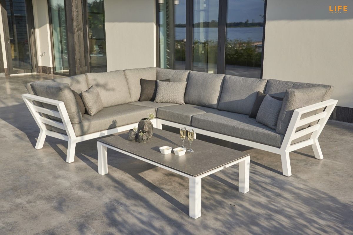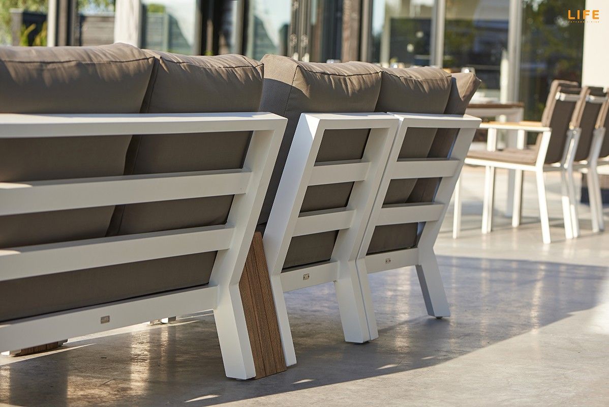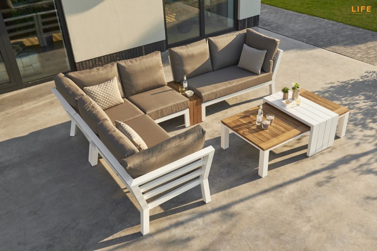 Krásná moderní rohová sedací souprava Timber Corner White bude zaručeně tím nejlepším společníkem pro Váš oddych po náročném dni. Sedací souprava má hliníkový rám, podsedáky a opěrkové polštáře jsou v šedém provedení Mist Grey Soltex odolné vůči všem typům počasí. Díky výškově nastavitelnému stolku Luka se můžete i pohodlně najíst, pokud si chcete vychutnat kávu nebo letní drink tak stolek jednoduše snížíte. Stolová deska je z ceramic concret look. Sedací souprava je dostupná i v antracitovém barevném prevedení. Pro aktuální dostupnost nebo více informací nás neváhajte kontaktovat.
