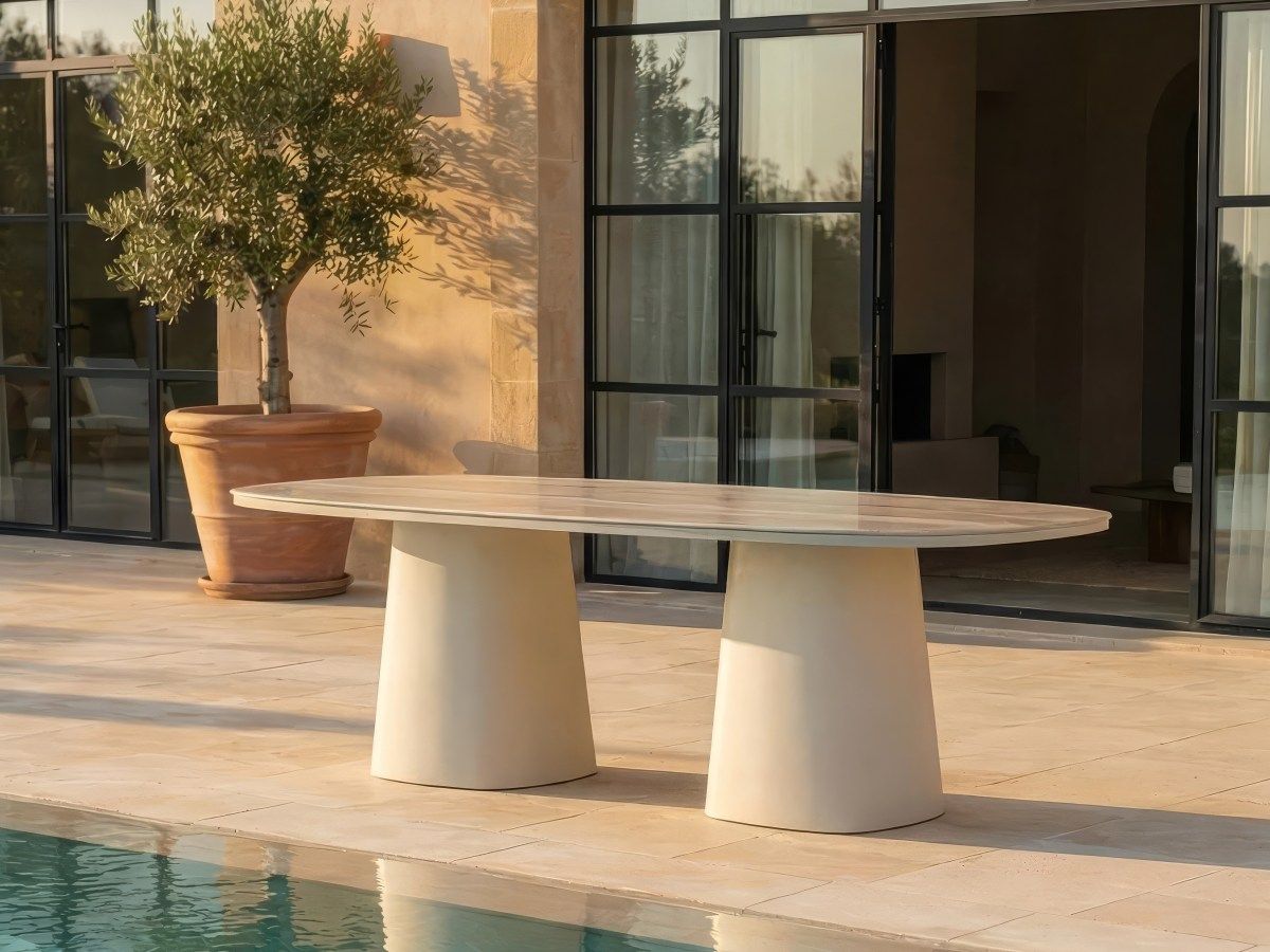 Stôl Beluga je synonymom pre nadčasovú eleganciu a sofistikovanú jednoduchosť. Jeho dizajn stavia na harmonickom spojení jemných, teplých tónov a autentického vzhľadu prírodného kameňa. Svojimi veľkorysými rozmermi a premyslenou konštrukciou je tento stôl ideálnou voľbou nielen pre súkromné terasy, ale aj pre náročné gastrosegmenty, kde sa vyžaduje reprezentatívny vzhľad spojený s vysokou odolnosťou.