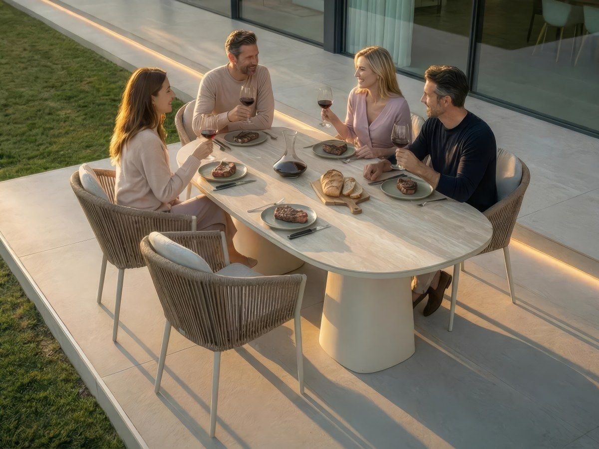 Odolnosť pre exteriér: Robustná hliníková konštrukcia v kombinácii so Sinterstone doskou robí zo stola dlhoročného partnera, ktorý si zachová svoj vzhľad aj po sezónach na priamom slnku či daždi.