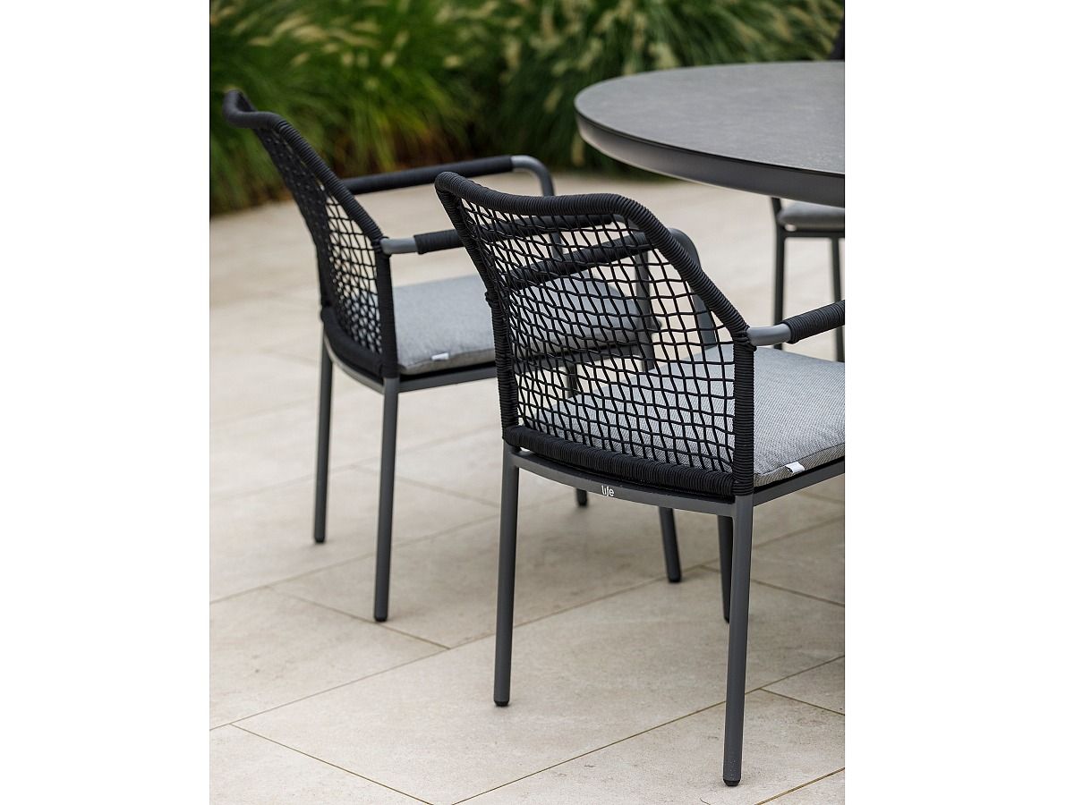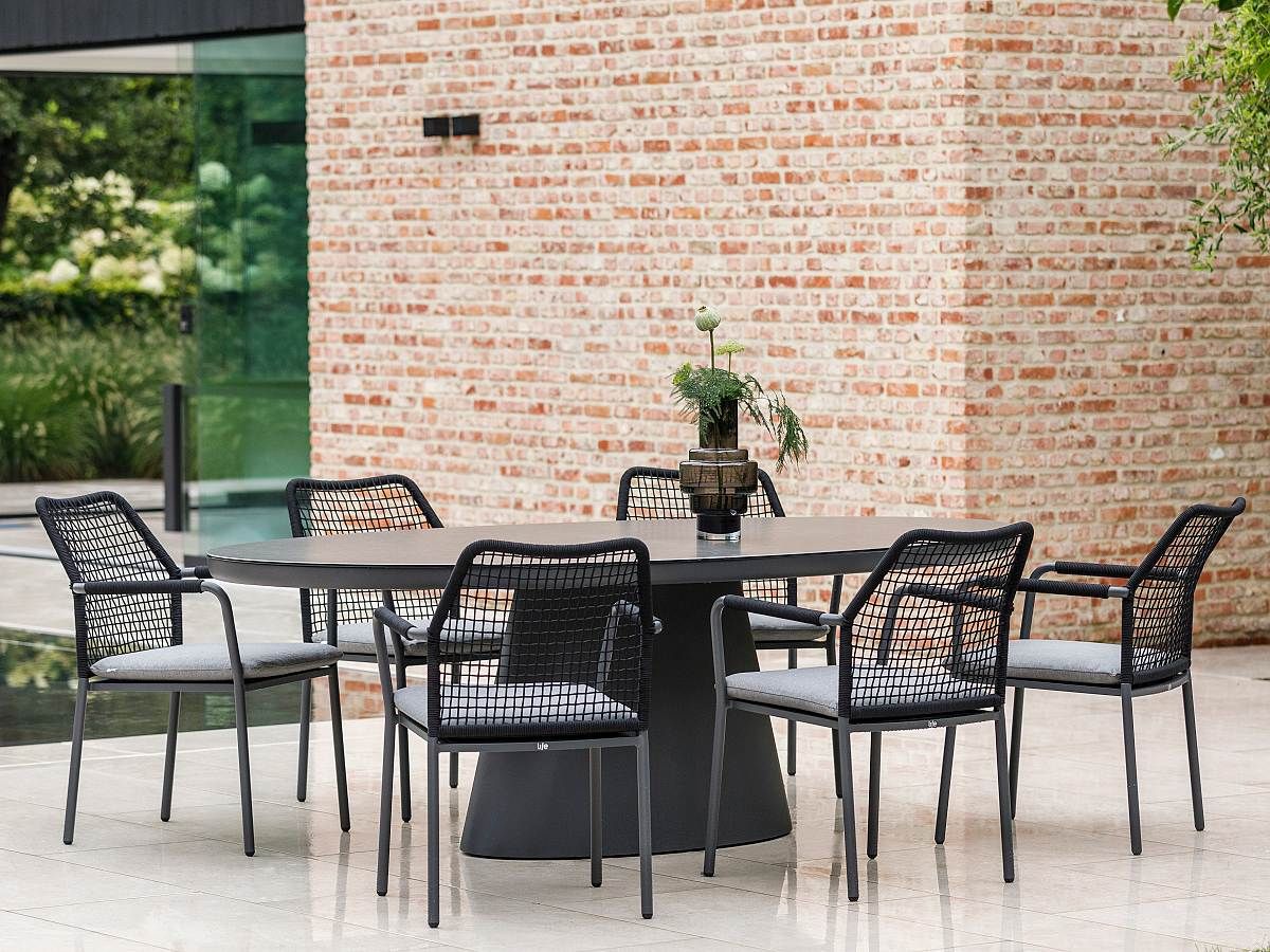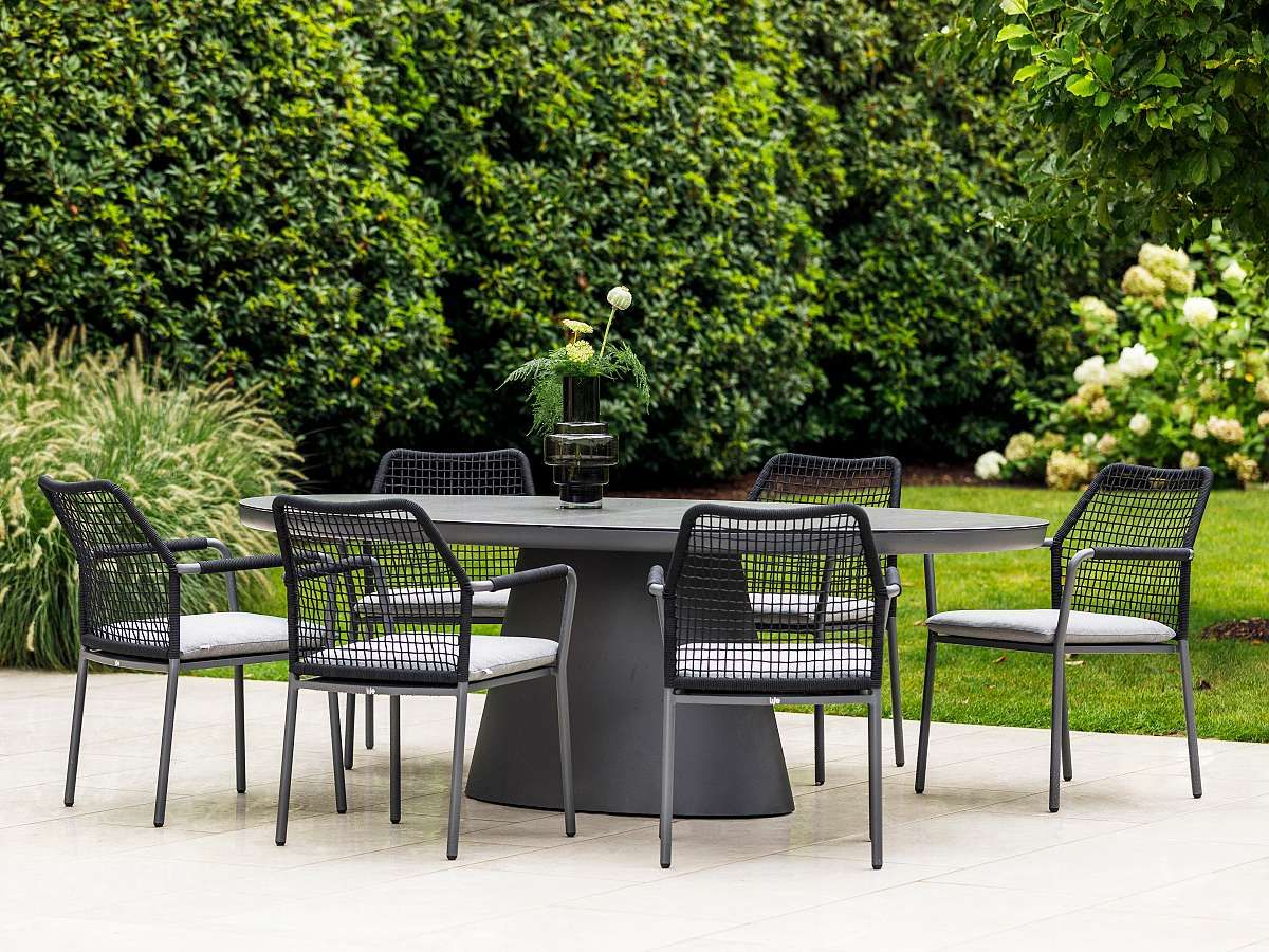 Elegantní zahradní stolová souprava Agarve Vienna Oval bude absolutní hvězdou Vaší terasy. Stůl má neobyčejný oválný tvar s centrální středovou nohou. Konstrukce stolu je z pevného hlíníku a je dostupná ve dvou barevných variantách - lava antracit a beige. Keramická stolová deska je dostupná ve 4 provedeních, které Vám na vyžádání zašleme. Židle Vienna je ideální volbou pro tento typ stolu díky jejímu modernímu a vzdušnému vzhledu. Židle Vienna je dostupná ve dvou barevných provedeních LAVA a BEIGE. Židle Vienna má zadní opěrkovou část ovinutou rychleschnoucími textilními lany. Podsedáky jsou z materiálu All Weather Soltex, díky kterým si užijete dokonalý. Vzhledem k použitým materiálům se nemusíte obávat ani letní bouřky. Stolová souprava je dostupná i v béžové barvě.