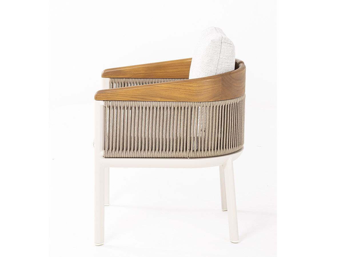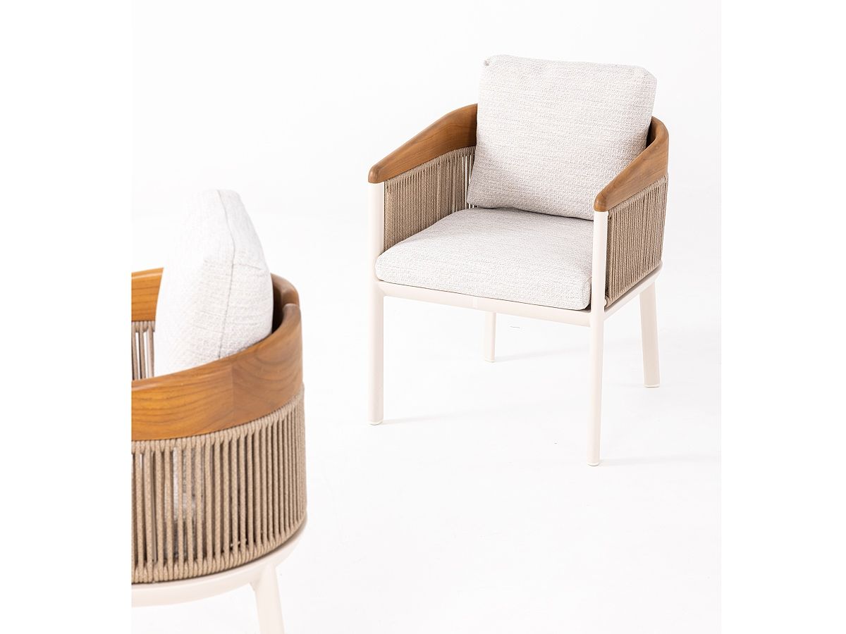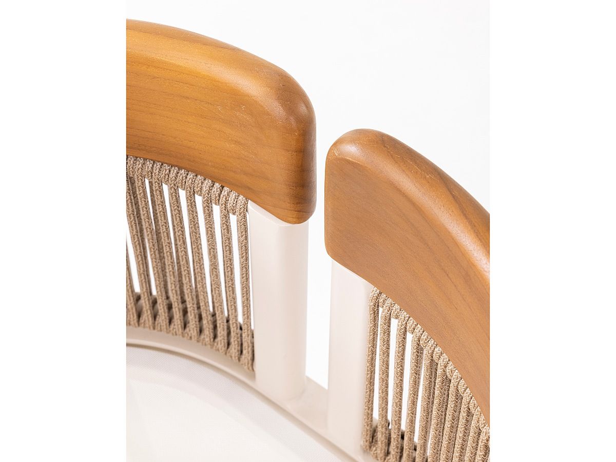 Konštrukcia: Hliníkový rám v jemnom odtieni Ivory (slonová kosť), doplnený o opierky rúk z pravého teakového dreva, ktoré dodávajú dotyk prírody a hrejivosti.