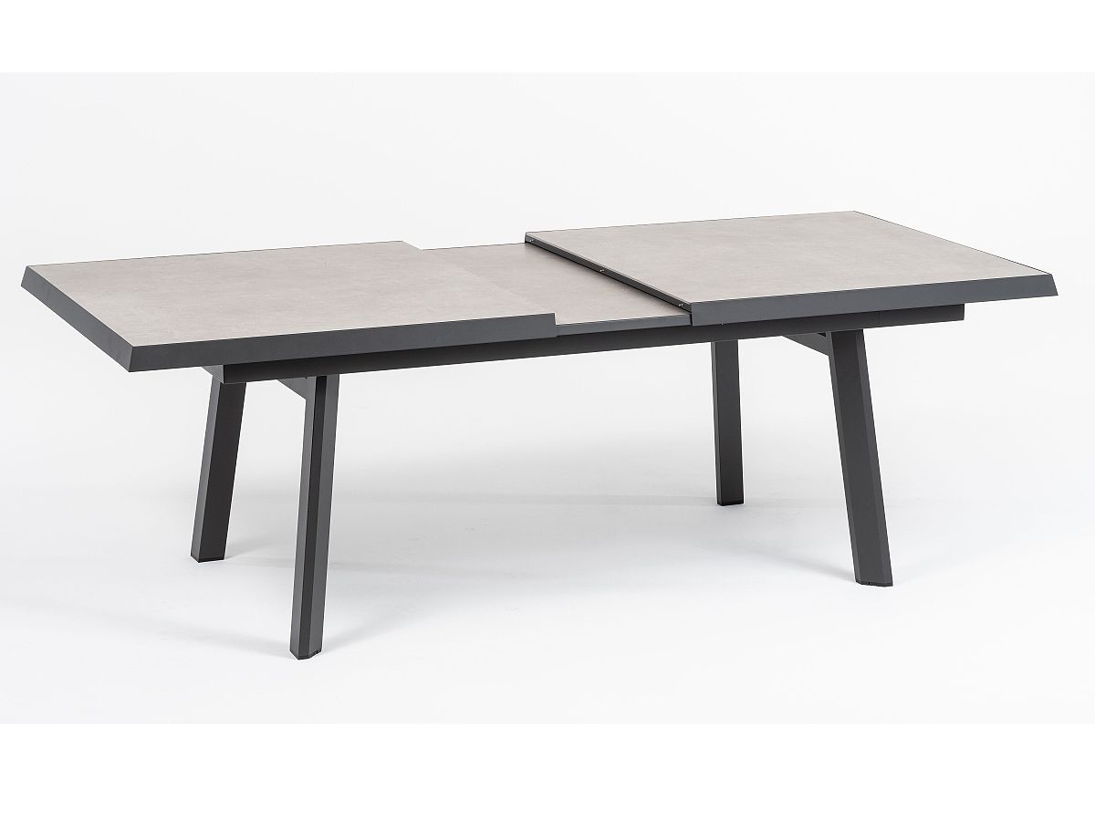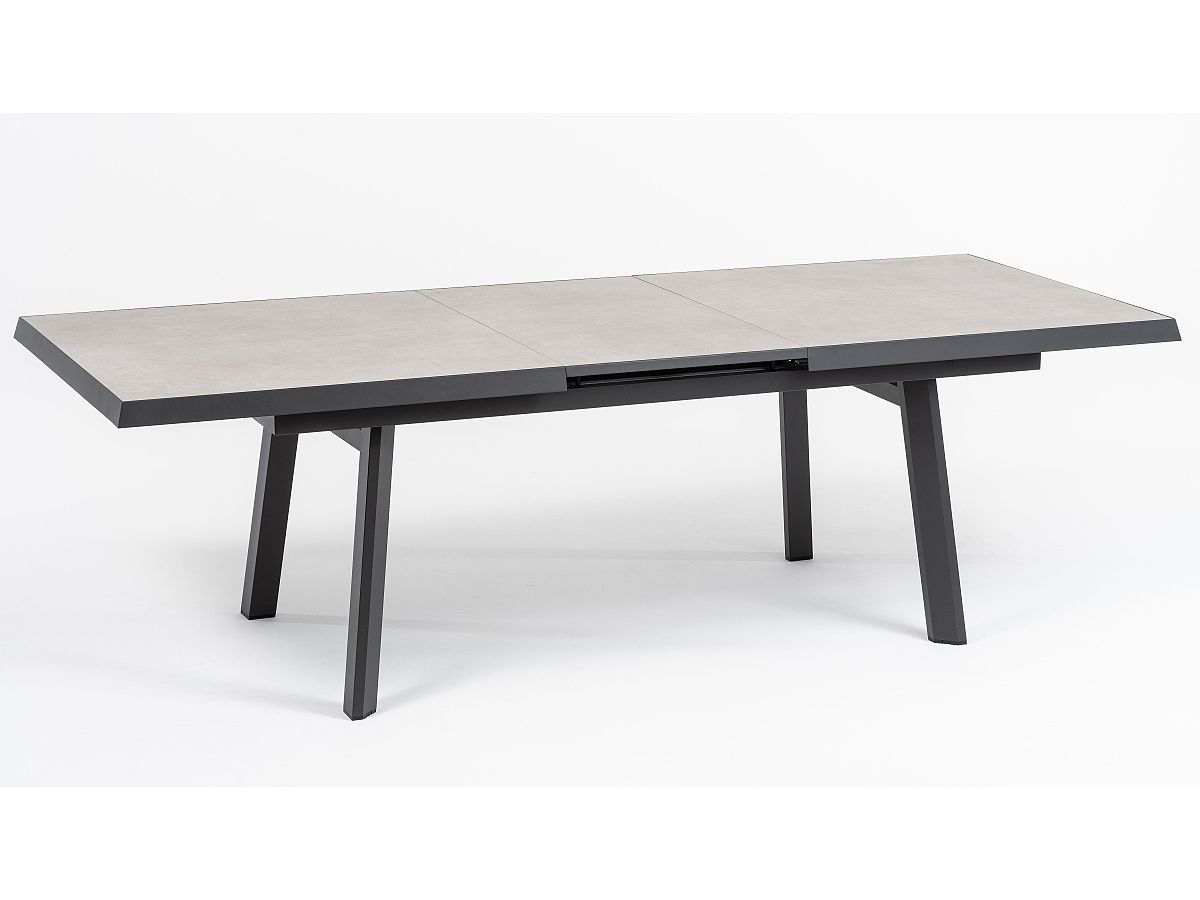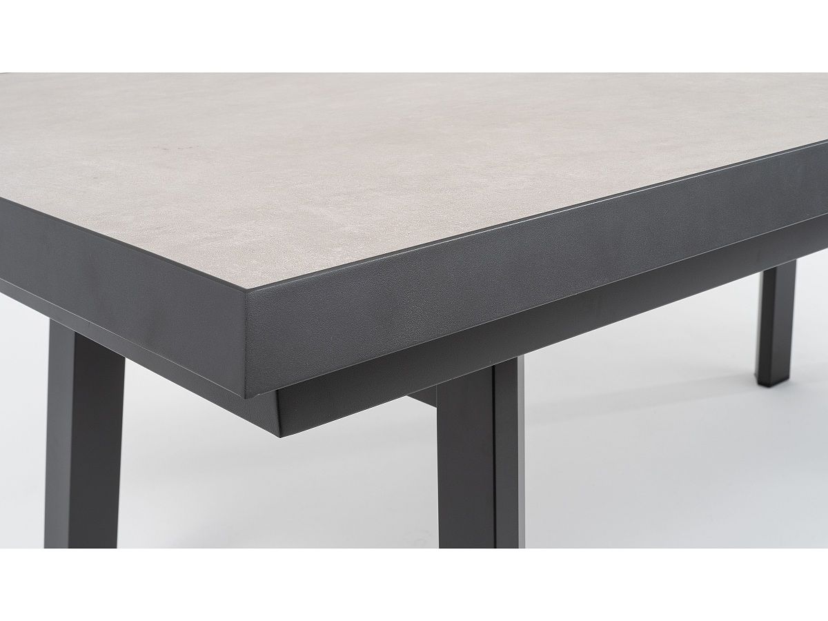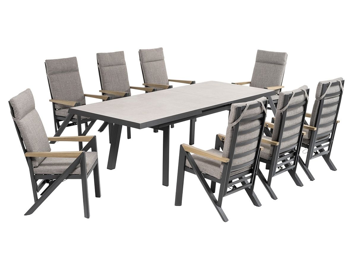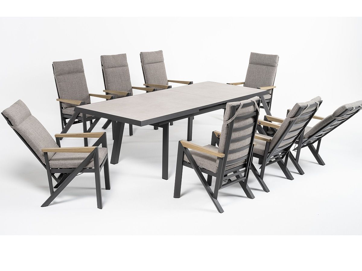 Praktická velká stolová sestava Empire bude dokonalým místem pro dlouhá letní posezení s přáteli. Konstrukce stolu i křesel je hliníková, stříkaná práškovou antracitovou barvou. Stolová deska je z tvrzeného skla s keramickým nástřikem světle šedé barvy a údržba stolu je zcela nenáročná. Díky velkým polohovatelným křeslům usadíte za roztahovací stůl až 8 hostů.