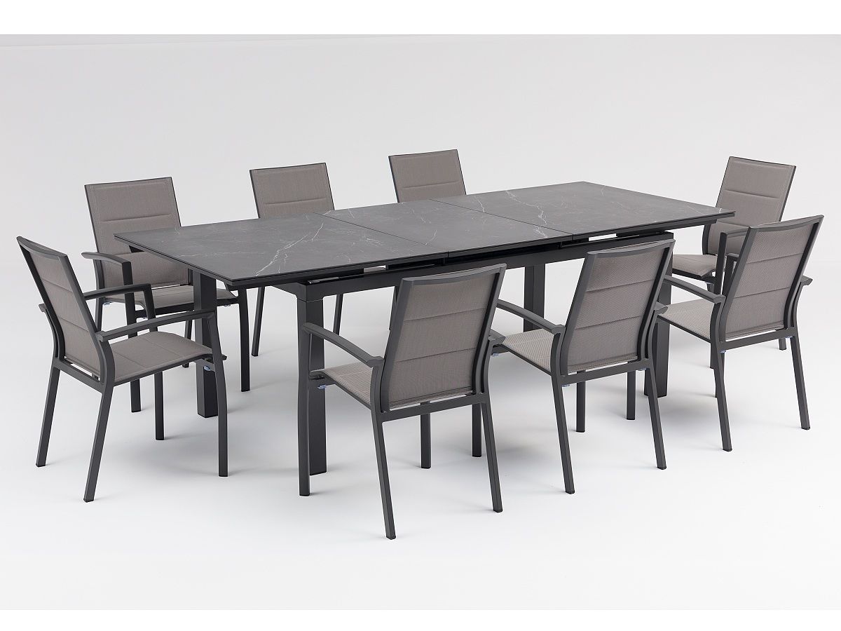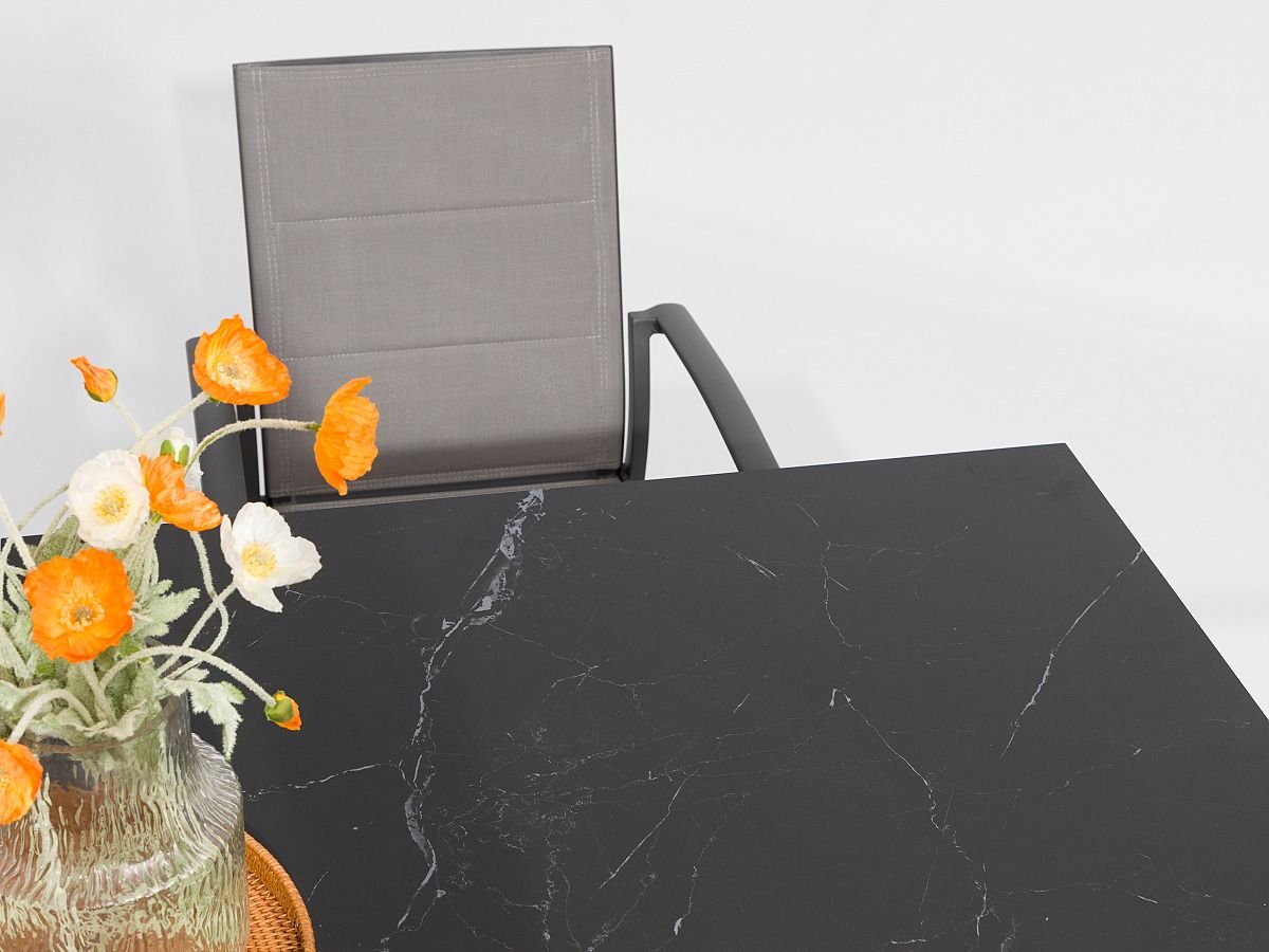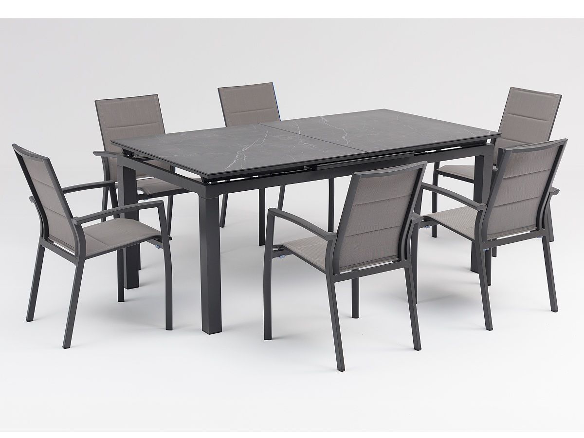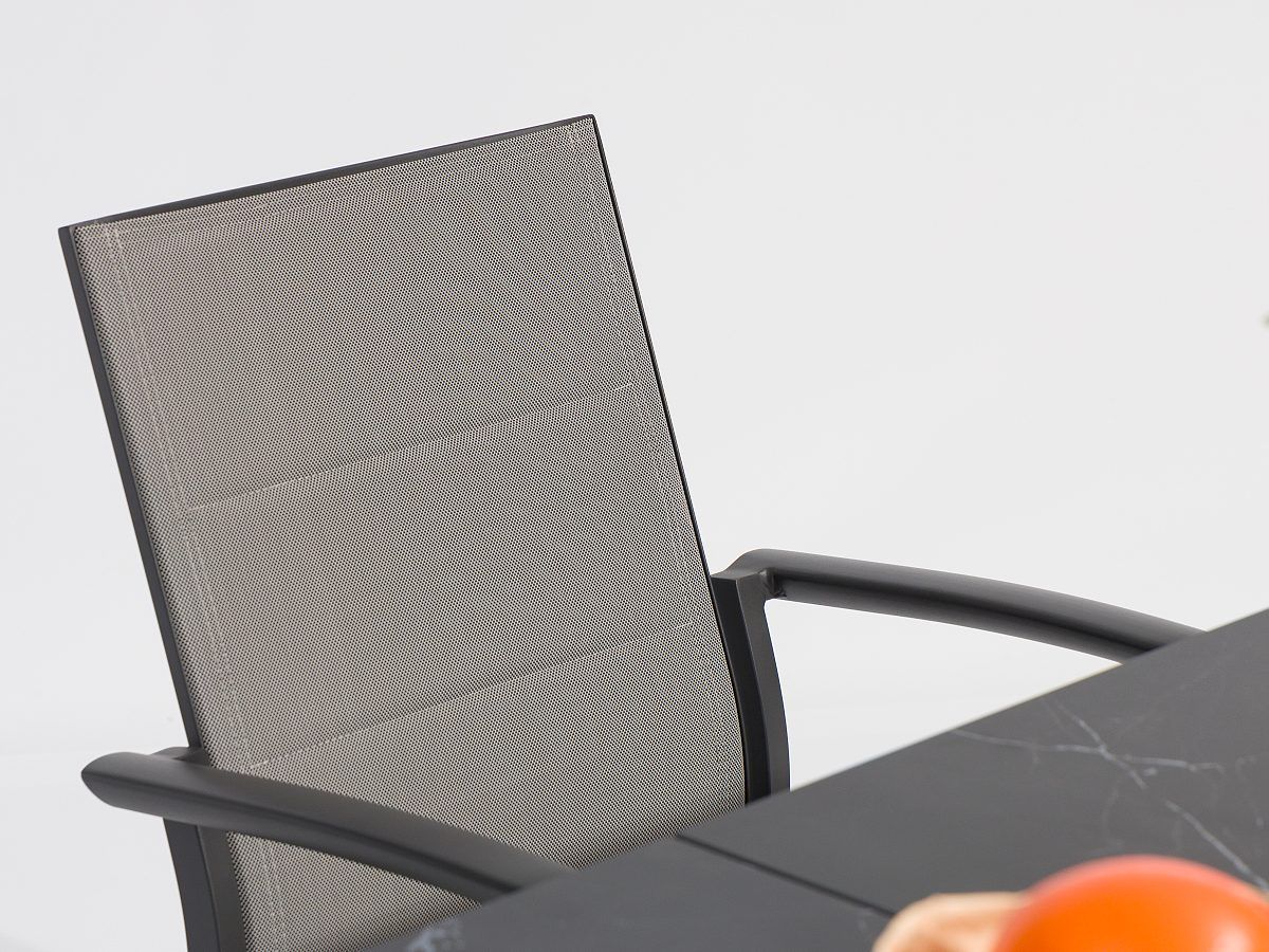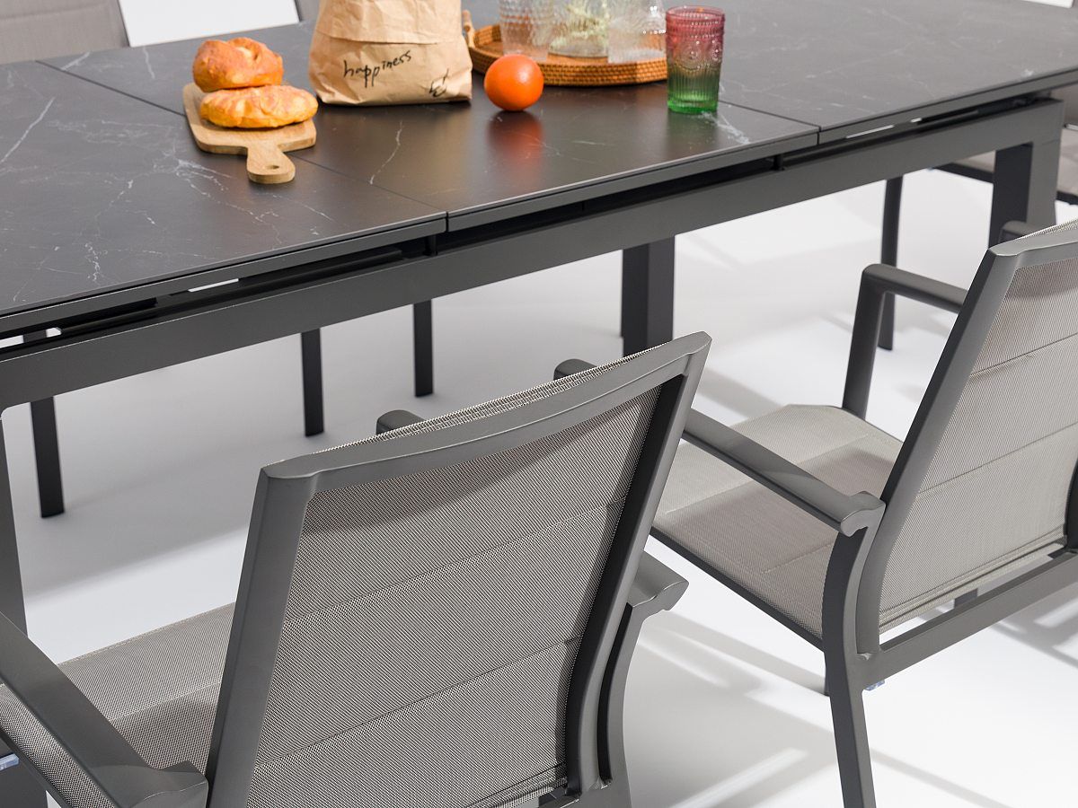 Moderní a praktický typ zahradní stolové soupravy, která Vám vydrží roky. Roztahovací stůl Merida má hliníkový rám antracitové barvy a stolová deska je z materiálu Sinterstone (umělý kámen) v barvě Armani Grey. Židle Merida má hliníkovou konstrukci a je potažená rychleschnoucím textilenem.