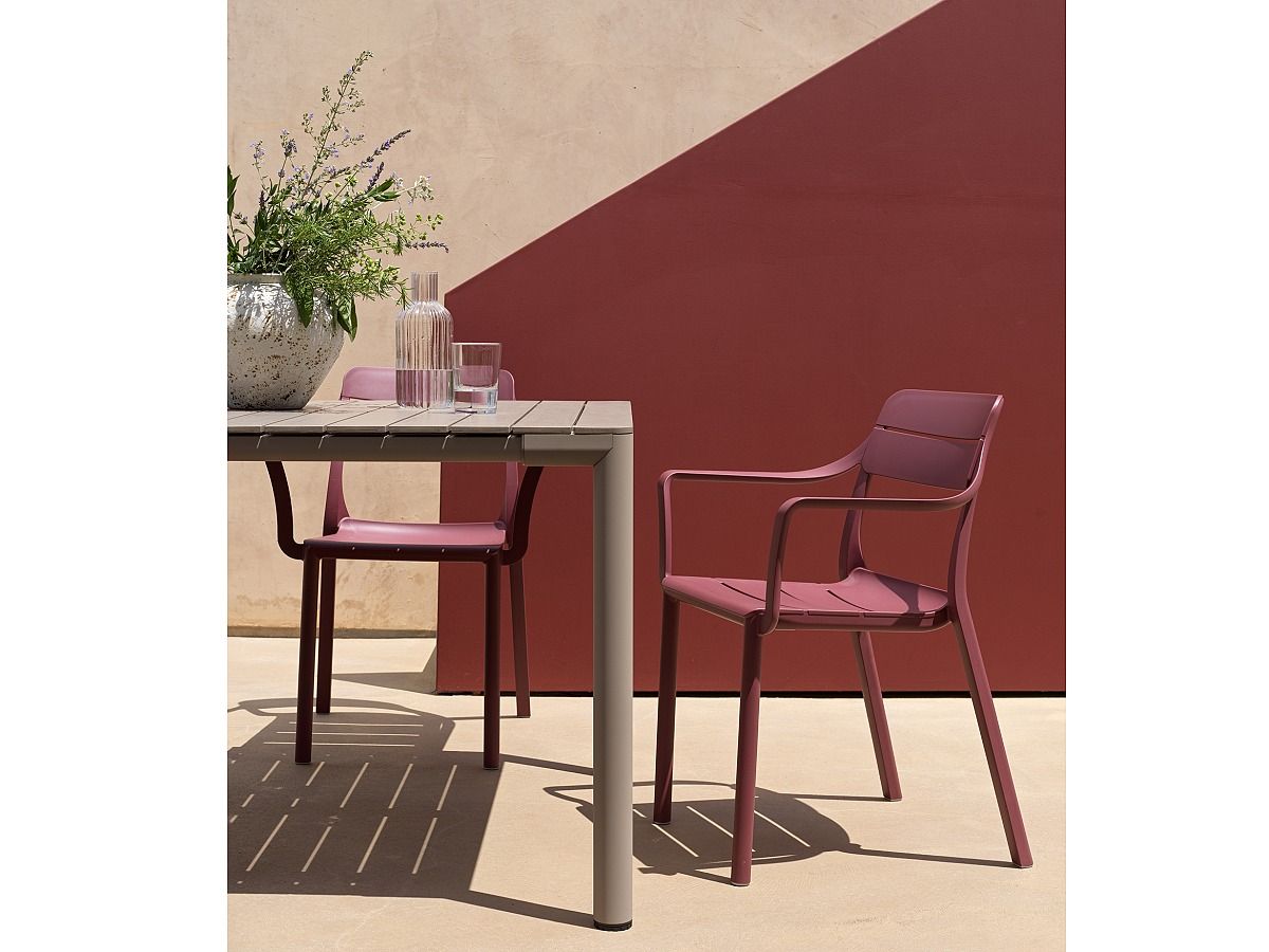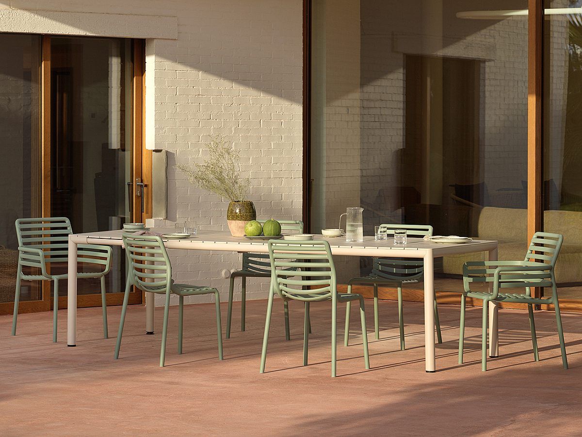 Moderní zahradní stolová sestava Tevere Doga je vyrobená z prvotřídních materiálů. Konstrukce stolu Tevere je z hliníku, který je stříkaný matnou práškovou barvou. Stolová deska je z tvrzeného plastu (polypropylen s příměsí laminátu a UV aditivy). Stůl má možnosť roztahování. Za pár sekund jednoduše roztáhnete stůl z původních 211 cm na 275 cm, takže ho dokonale využijete na rodinných oslavách. Můžete si vybrat ze 4 barevných variant. Židle Doga je v této stolové sestavě zastoupená ve dvou provedeních, a to jako Doga Bistrot (bez područek) a Doga Armchair (s područkami). Obě varianty židle Doga jsou vyrobené z tvrzeného plastu zpevněného skelným vláknem. Židle je dostupná v 8 barevných variantách, takže se nemusíte bát experimentovat a do jednoho prostoru použít více barev.