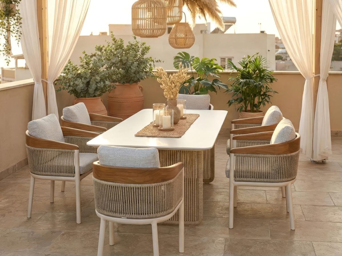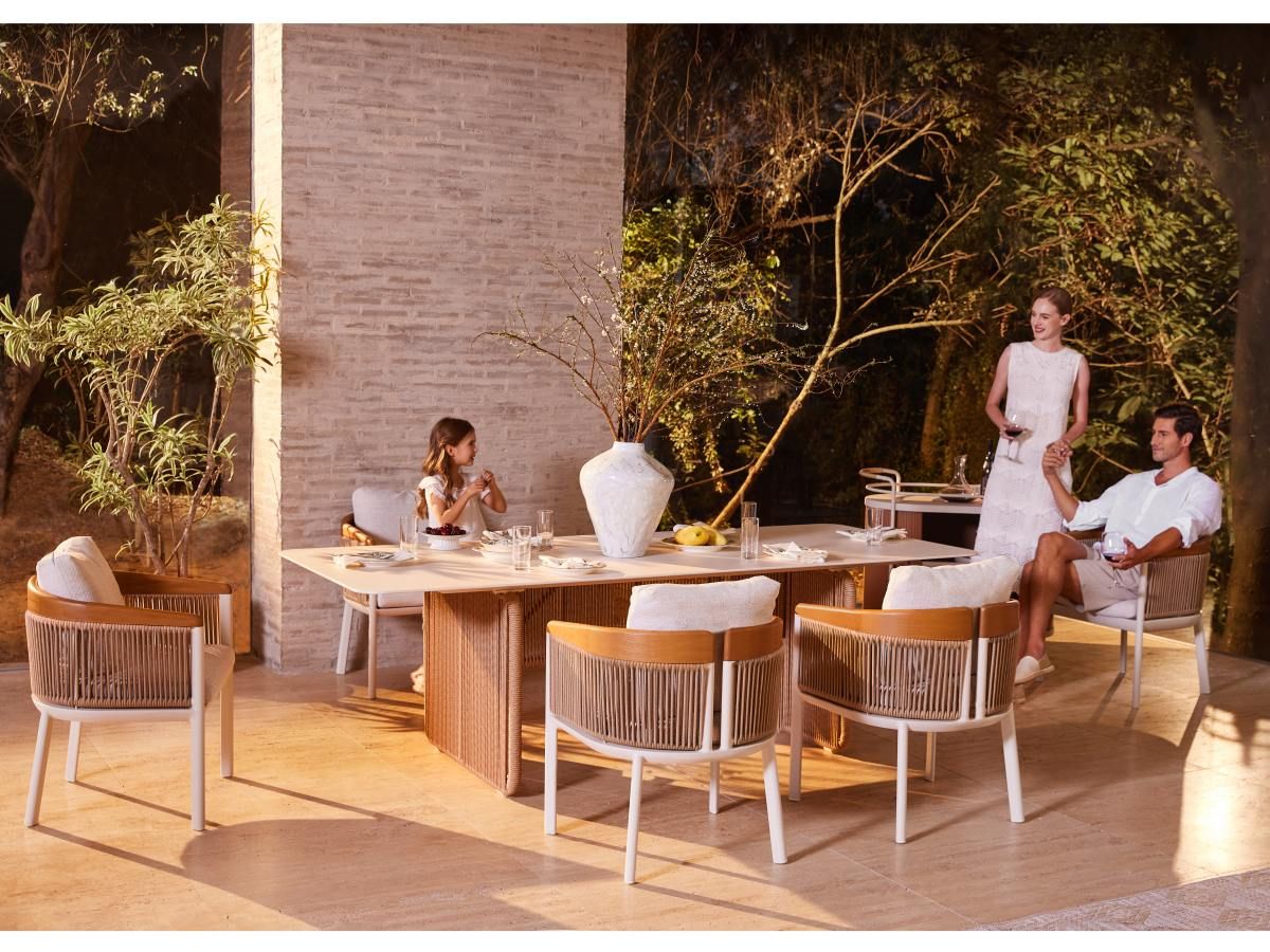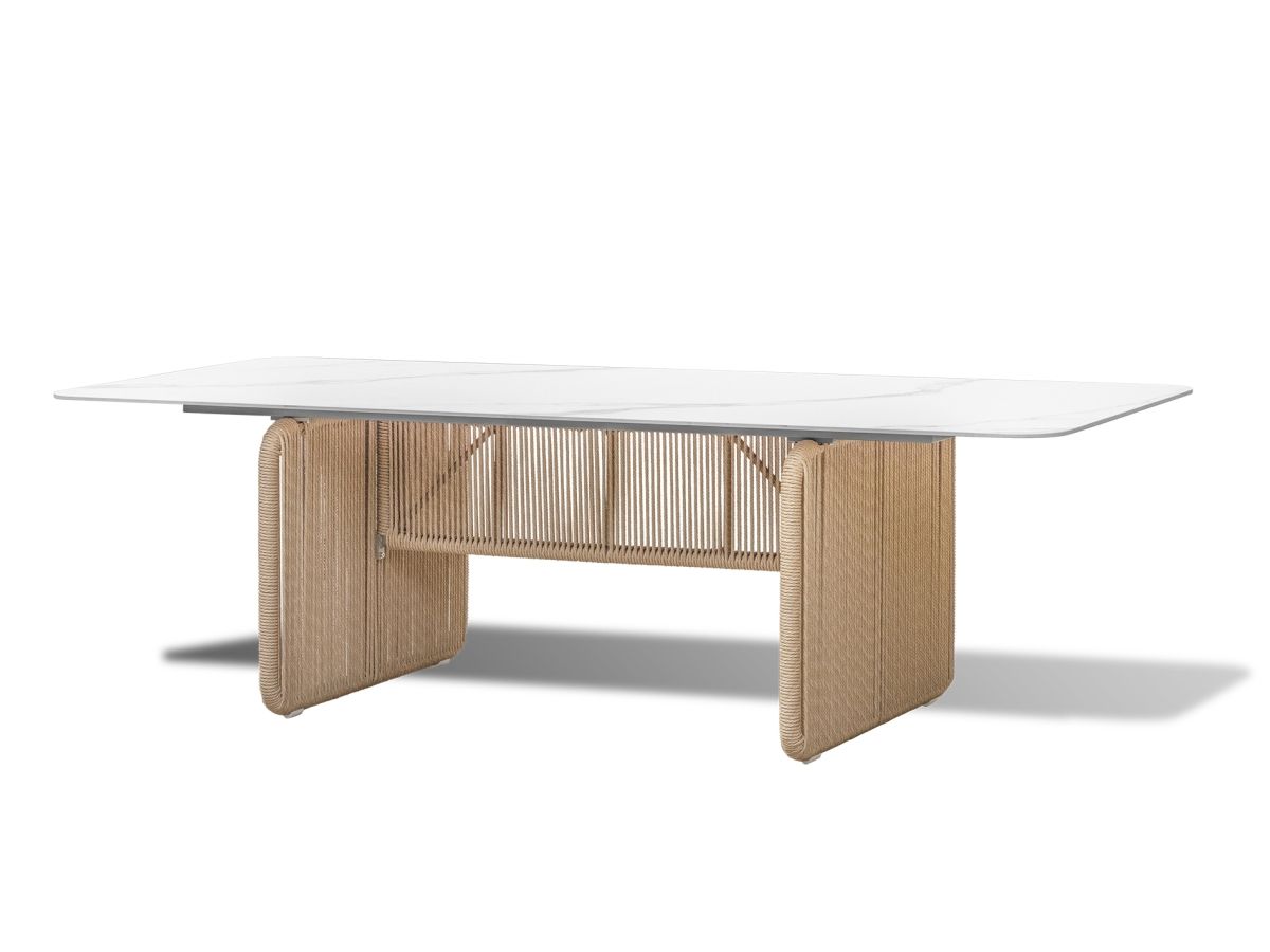 Stôl Bienno je skutočným dizajnovým skvostom. Spája modernú architektúru s jemnými detailmi inšpirovanými prírodou. Jeho robustná konštrukcia v odtieni Ivory je po bokoch ozvláštnená dekoratívnym výpletom zo šnúr vo farbe „taupe“, čo stolu dodáva jedinečný, remeselne prepracovaný vzhľad. V kombinácii s veľkorysou doskou zo Sinterstonu ide o kus nábytku, ktorý na terase okamžite upúta pozornosť a vytvorí luxusné zázemie pre každú spoločenskú udalosť.