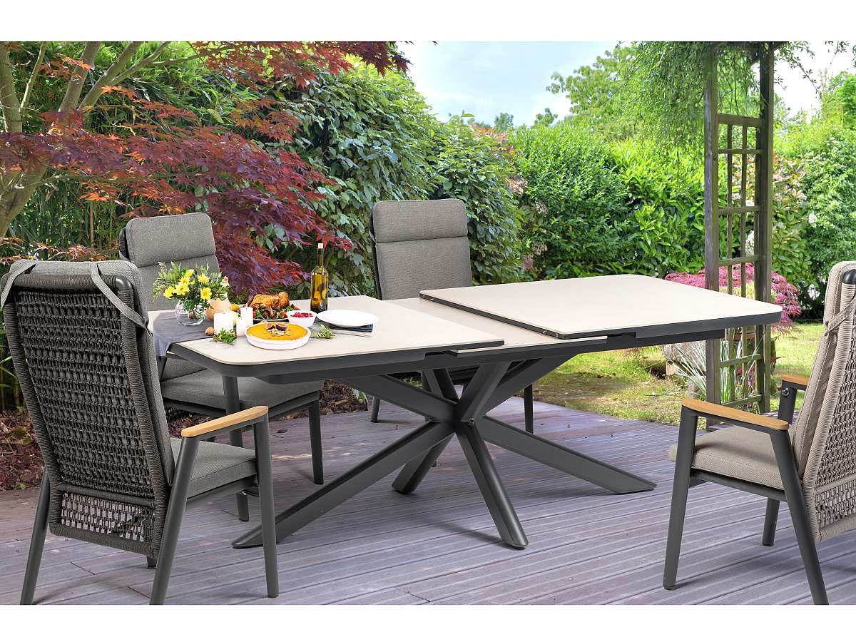 Nádherný a elegantný rozťahovací záhradny stôl Boat Flex Váš očarí hneď na prvý pohľad a bude hviezdou každej terasy. Rám stola je hliníkový striekaný Antracitovou farbou. Stôl má stolovú dosku z materiálu sinterstone - umelý kameň a je v béžovom dekore. Jeho eleganciu zvýrazňujú krásne oblé hrany. Rozťahovanie stola je veľmi jednodúché. Vďaka použitým materiálom je stôl veľmi jednoduchý na údržbu K stolu Boat Flex sa ideálne hodia kreslá Aqua, ktoré máme dostupné v dvoch farebných prevedeniach. Nájdete ich v sekcii stoličky.