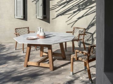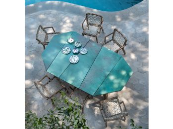 Majestátný a luxusní stůl Rafael bude hlavní hvězdou Vaší terasy nebo altánku. Jeho konstrukce je z kvalitního certifikovaného teakového dřeva a je dostupná ve dvou barevných variantách - klasická přírodní hnědá nebo šedá barva teaku. Vrchní stolovou deska můžete být z mramoru nebo smaltový lávový kámen ve smaragdově zelené barvě. Obě dvě varianty stolové desky jsou extrémně odolné vůči všem typům počasí, škrábnutím a mají nízkou absorbci vody. Ke stolu Rafael pohodlně usadíte 10 lidí. Dokonale se k němu hodí židle Rafael, které máme v nabídce a nejdete je v sekci Židle a křesla.