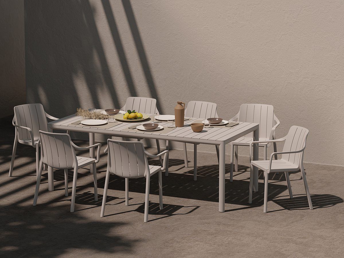 Krásný roztahovací zahradní stůl Tevere se pyšní elegantním designem s hladkými liniemi bez ostrých hran a zaoblenými nohami. Deska stolu je vyrobená směsí polypropylenu se skelným vláknem s anti-UV úpravou, která zabezpečuje odolnost vůči povětrnostním vlivem a slunečnímu záření. Na rám a nohy stolu je použitý lakovaný hliník. Stůl má nastavitelné nohy, které zabezpečují stabilitu i na nerovném povrchu. Stůl má praktický roztahovací mechanismus.
