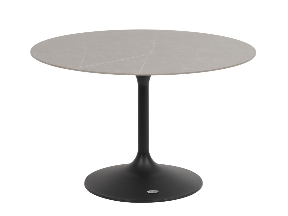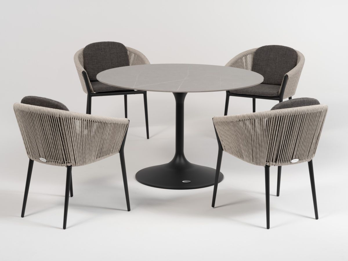 Jedálenský stôl Verona Grau zaujme svojím moderným až sochárskym dizajnom. Elegantný štýl „tulipánovej“ centrálnej nohy nie je len vizuálnym lákadlom, ale zabezpečuje aj úplnú voľnosť pohybu nôh okolo celého stola. Kombinácia antracitovej podnože a sivej dosky zo Sinterstonu dodáva tomuto modelu mestský, nadčasový charakter, ktorý bez problémov zapadne do moderne navrhnutých terás alebo zimných záhrad.