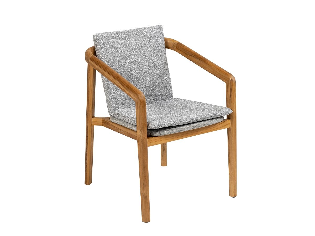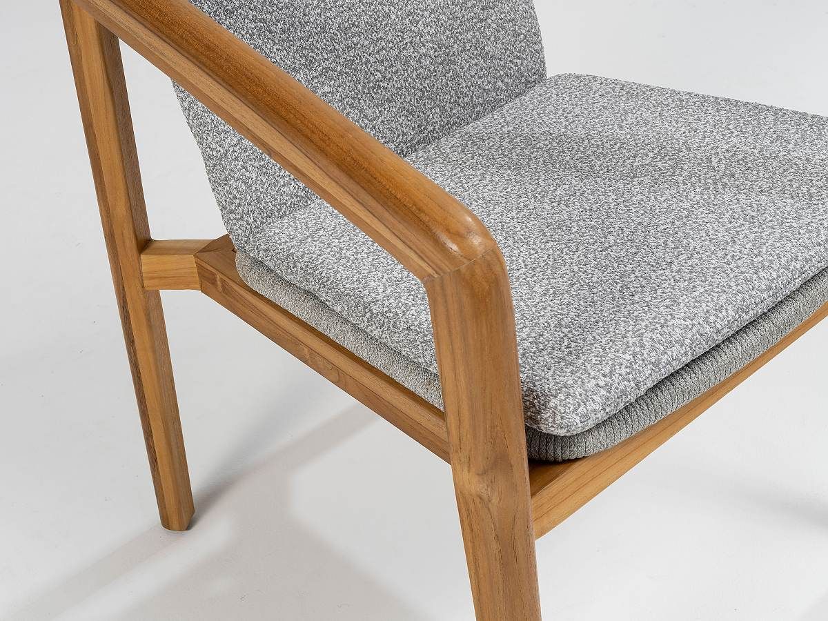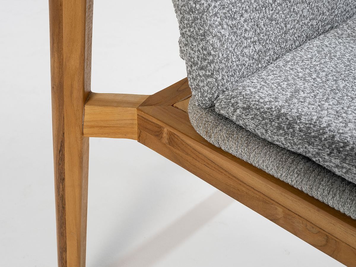 Kreslo Brasilia je stelesnením prírodného luxusu. Dominantná konštrukcia z masívneho teakového dreva s jemne zaoblenými podrúčkami pôsobí robustne a zároveň elegantne. Moderný nádych dodáva kombinácia sivej technickej textílie a štruktúrovaného „bouclé“ polstrovania. Ide o ideálny kúsok pre prémiové jedálenské priestory, lounge zóny alebo štýlové zastrešené terasy, kde sa kladie dôraz na detail a kvalitu materiálov.