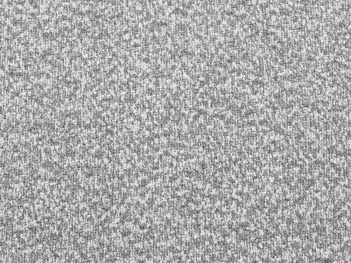• Čalúnenie: Sedacie a chrbtové vankúše z exkluzívnej sivej melírovanej látky (typ Bouclé) s bohatou textúrou, určené pre outdoorové využitie.