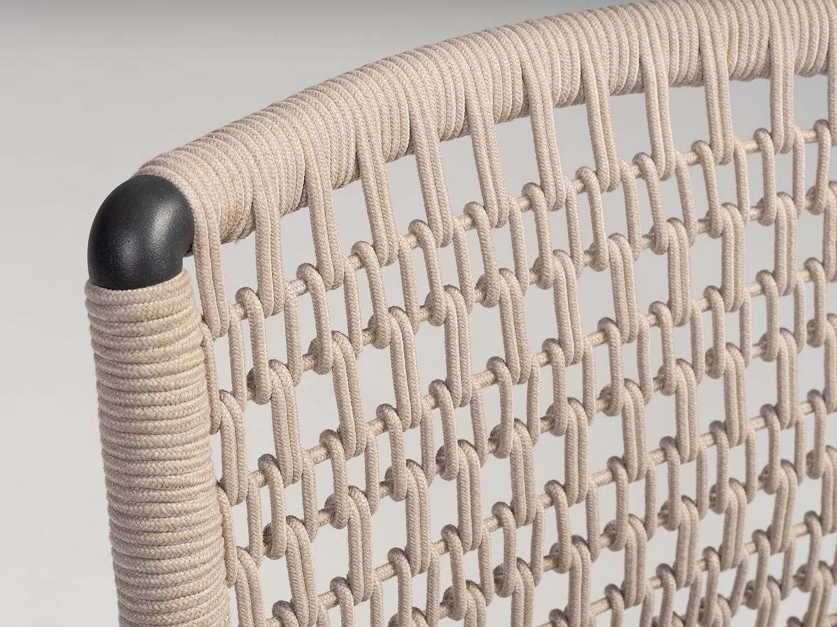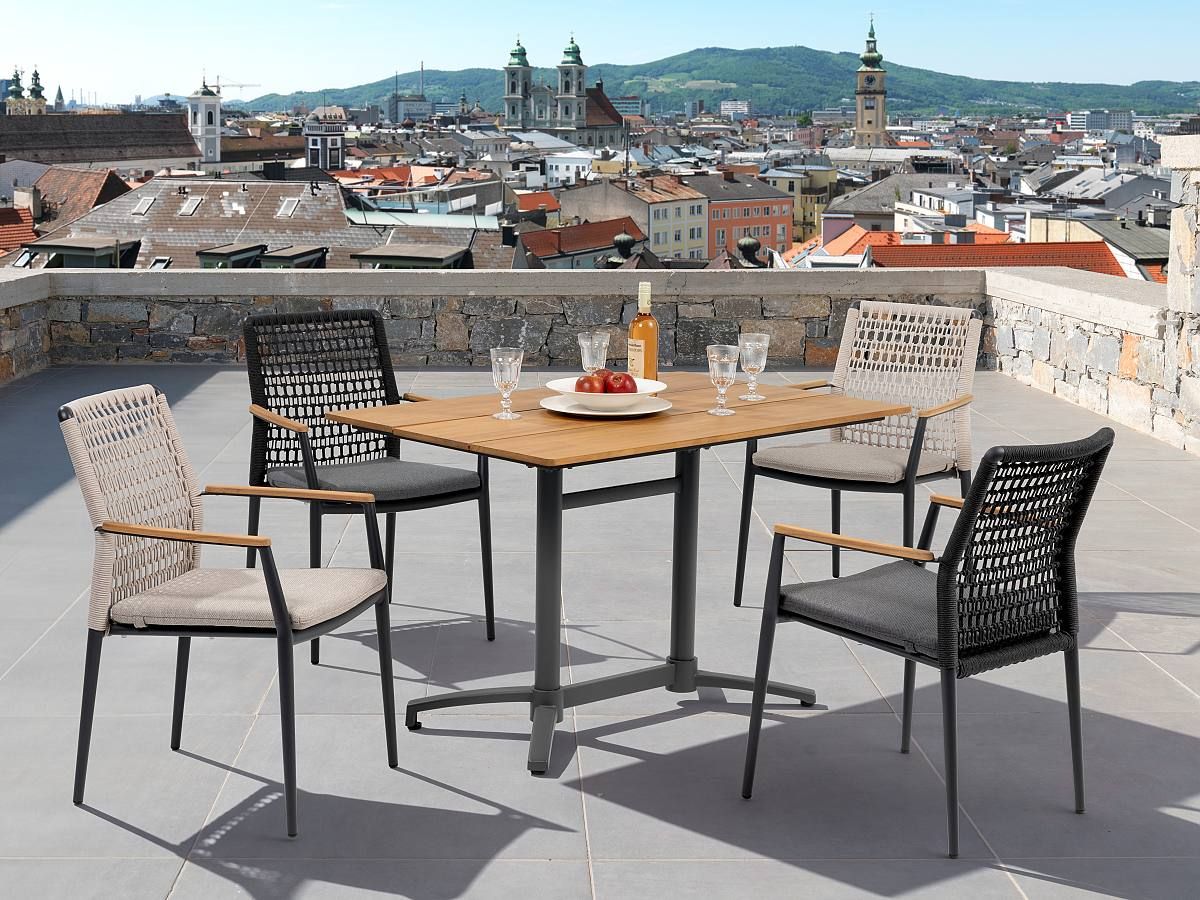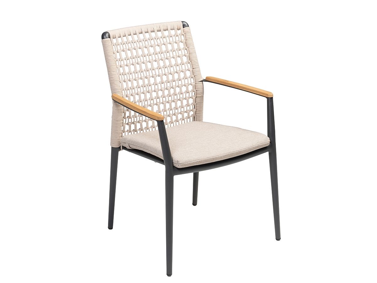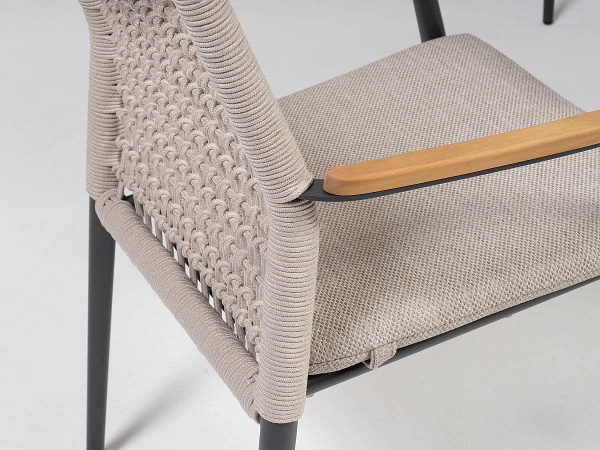 Vzdušná a elegantní židle Grenada je díky použitým materiálům ideální na terasy hotelů a restaurací, ale stejně tak bude hvězdou terasy rodinného domu. Židle Grenada má hliníkovou konstrukci antracitové barvy, zádové opěradlo je ručně ovinuté syntetickým lanem béžové barvy, které dodává židli moderní vzhled. Podsedák je voděodolný, takže se nemusíte obávat ani letního deště. Ruční opěrky jsou z teakového dřeva. Židle Grenada je dostupná ve dvou barevných provedeních - beige a grau.