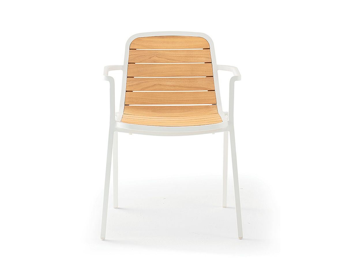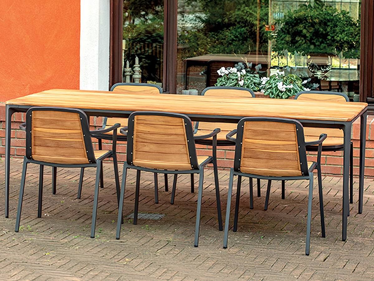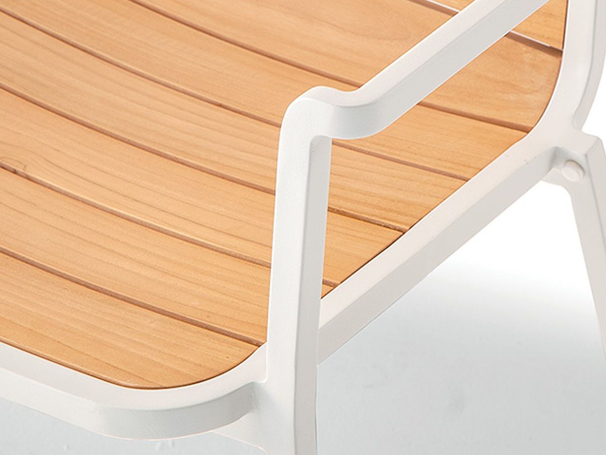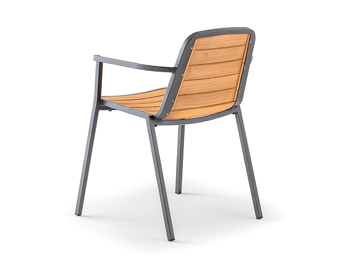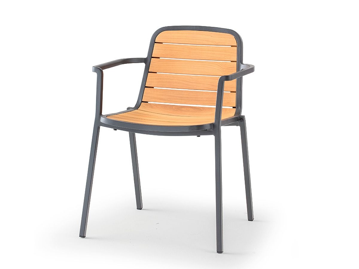 Elegantná záhradná stolička Nida Teak  je ideálnou voľbou ako terasová stolička pre hotely a reštaurácie. Rám stoličky je z hliníku a je striekaný práškovou antarcitovou alebo bielou farbou. Sedacia časť, chrbtová časť aj opierky sú z teakového dreva.