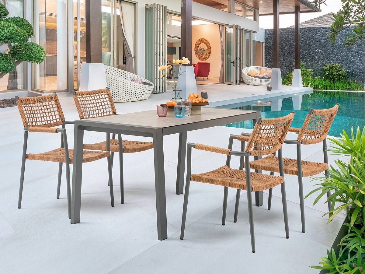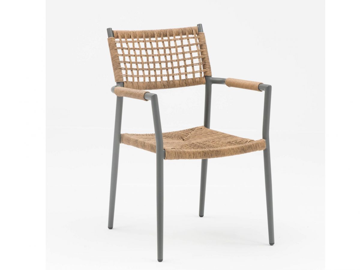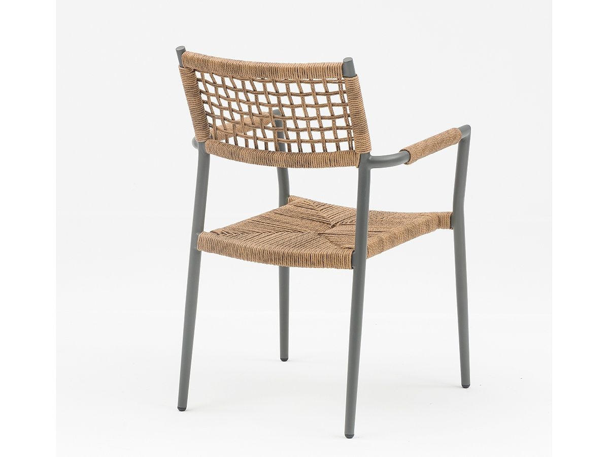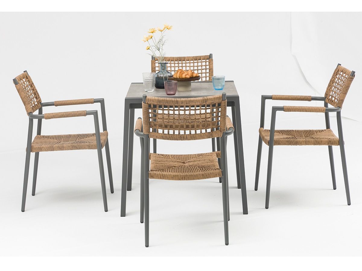Vzdušná a velmi praktická zahradní židle Pepito je díky použitým materiálům ideální na terasy hotelů, restaurací i barů. Židle Pepito má hliníkovou konstrukci antracitové barvy, zádové opěradlo, opěrky na ruce i podsedák jsou ručně ovinuté syntetickým PVC lanem v přírodním vzhledu. Židle Pepito bude krásně vynikat u menších stolů s rozměry 70x70 a 80x80 cm. .